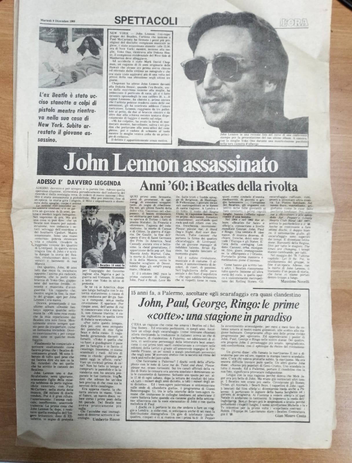 Pagina singola del giornale L’ORA datata Martedì 9 Dicembre 1980, che riporta la notizia della morte di John Lennon.